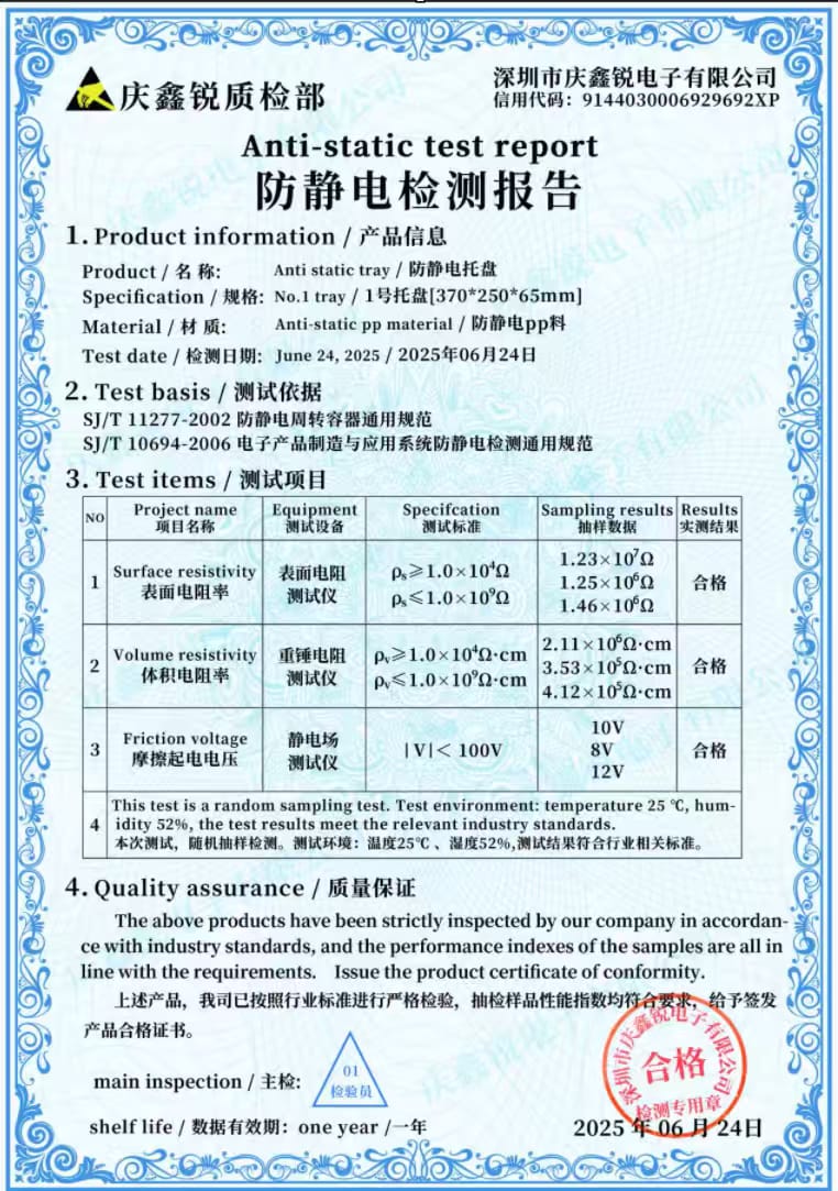 The test basis/methods used are SJ/T 11277 and 10694 which are Chinese standards. The packaging section of ANSI/ESD S20.20 requires that the resistance measurements meet ANSI/ESD STM11.11, STM 11.12, or STM11.13. Unless the Chinese standards can be proven to be technically equivalent to the ANSI/ESD standards, this would not be acceptable for ANSI/ESD S20.20 certification